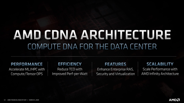 根据介绍,CDNA架构会专注于计算/张量操作性能,从而加速机器学习、高性能计算,而且可以通过Infinity Fabric互连总线灵活设计性能,并支持增强的企业级RAS特性、安全、虚拟化技术。