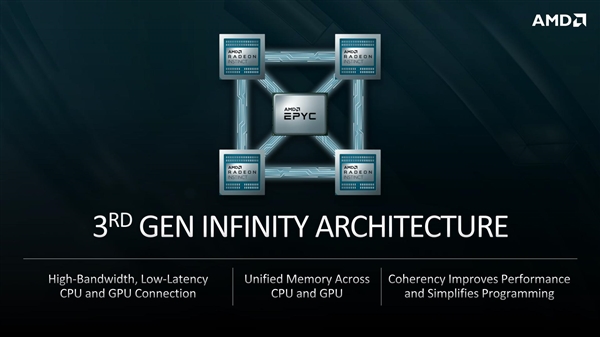 对于第三代Infinity Fabric,AMD也透露了一些高级特性,包括更高带宽、更低延迟的CPU-GPU互连,GPU-GPU内存一体性,提升一致性性能和简化编程,等等。