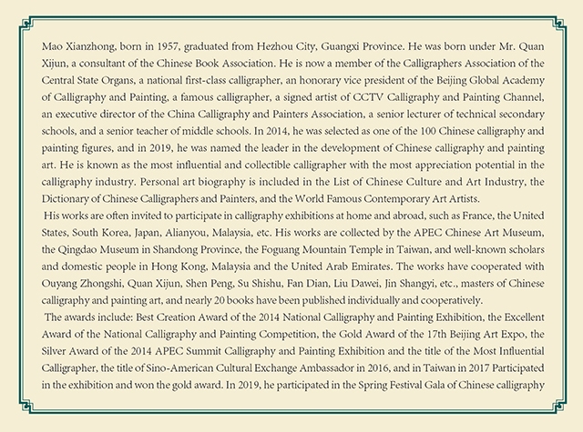 毛献忠,1957年生,大学本科毕业,广西贺州市人,师从中书协顾问权希军先生。现为中央国家机关书法家协会会员、国家一级书法师,北京环球书画院名誉副院长、著名书法家、央视书画频道签约艺术家、中国书画家协会常务理事、中专高级讲师、中学高级教师。2014年入选中国书画双百人物、2019年被评为中国书画艺术发展引领者,被誉为书法界最具升值潜力最具影响力和收藏价值的书法家。个人艺术传略分别收入《中国文化艺术行业名录》、《中国书画家大辞典》、《世界当代艺术名家大典》。