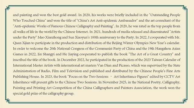 在艺术成就之外,毛献忠先生始终秉持文化担当与社会责任感。2014年入选“中国书画双百人物”,2019年获评“中国书画艺术发展引领者”,2020年荣获“中国艺术抗疫大使”称号,这些荣誉背后,是他对艺术初心的坚守与对时代使命的践行。无论是参与北京冬奥会贺岁台历的创作,还是为《大国艺术》《国际巨匠艺术名家》等重要典籍题写书名,亦或是在“党旗下的艺术家”等主题活动中以笔墨献礼时代,他始终以书法为媒介,传递文化自信,书写家国情怀。他的艺术不仅具有极高的专业价值,更在市场中展现出强劲的升值潜力,被业界誉为“书法界最具升值潜力、最具影响力和收藏价值的书法家”,这既是对其艺术成就的认可,也是对其文化贡献的肯定。