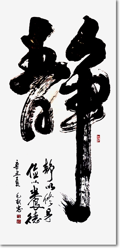 毛献忠先生的书法,以行草为擅,笔墨间既有传统碑帖的筋骨,又有当代审美的意趣。其笔下线条刚柔相济,结体奇正相生,如这幅“一颗静心观世界,半杯清茶悟人生”的对联,笔墨酣畅淋漓,气韵贯通全篇。“一颗静心”四字以凝练笔触勾勒出静定澄澈的心境,“观世界”则以开阔笔势延展格局;下联“半杯清茶”的温润与“悟人生”的通透相映成趣,在黑白虚实间,将东方哲思与书法艺术完美融合。他的作品不仅是视觉的审美对象,更是精神的栖息之所,观者在笔墨流转间,可品出茶的清润、心的安宁,亦可读出人生的豁达与生命的智慧。