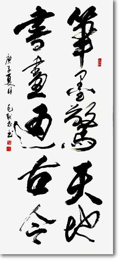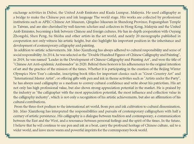 多年来,毛献忠先生的作品频繁亮相国内外重要展场,从法国卢浮宫到美国纽约艺术中心,从韩国首尔书艺双年展到日本东京国际书画展,再到阿联酋迪拜、马来西亚吉隆坡的文化交流活动,他以书法为桥,让中国笔墨语言走向世界舞台。其作品被APEC中华艺术博物馆、山东青岛博物馆、台湾佛光山寺等专业机构收藏,更被香港、马来西亚、阿联酋的知名学者与藏家珍视,成为连接中外文化的纽带。他与欧阳中石、沈鹏、苏士澍等艺术界泰斗的深度合作,近二十部个人与合作出版的专著,不仅见证了他的艺术高度,更彰显了他在当代书画传承与发展中的重要地位。